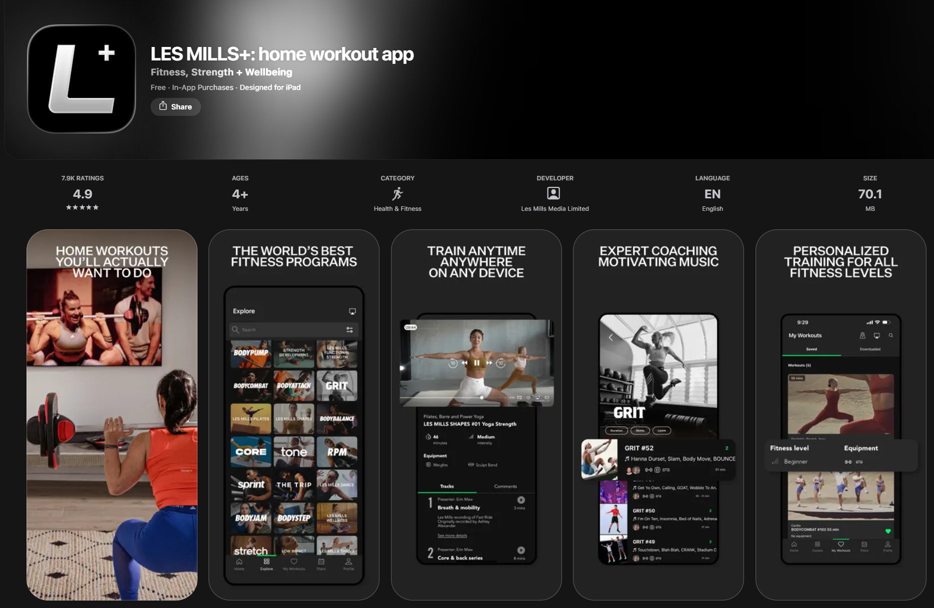 The app is called “LES MILLS+: home workout app” on iPhone and iPad devices