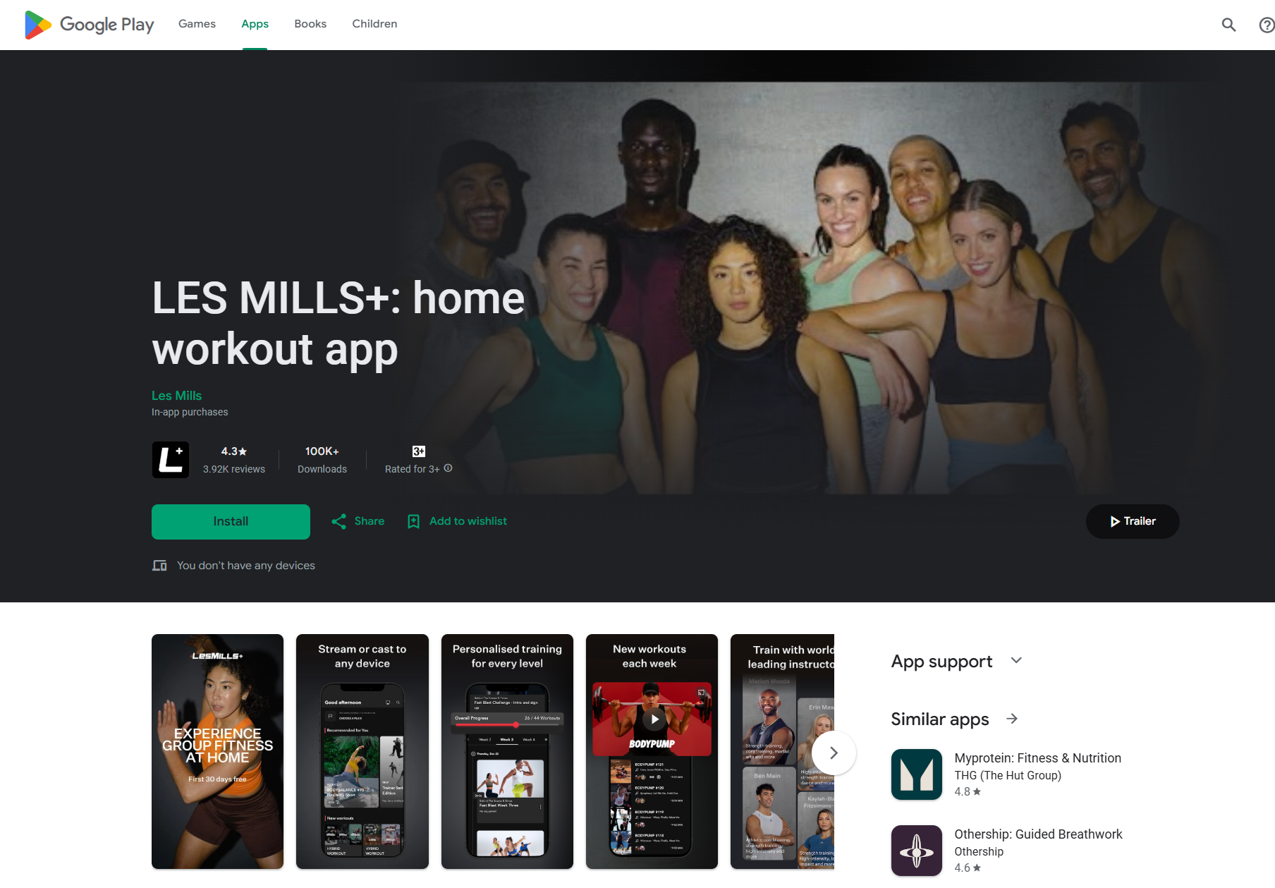 Install the LES MILLS+ app from Google Play store.